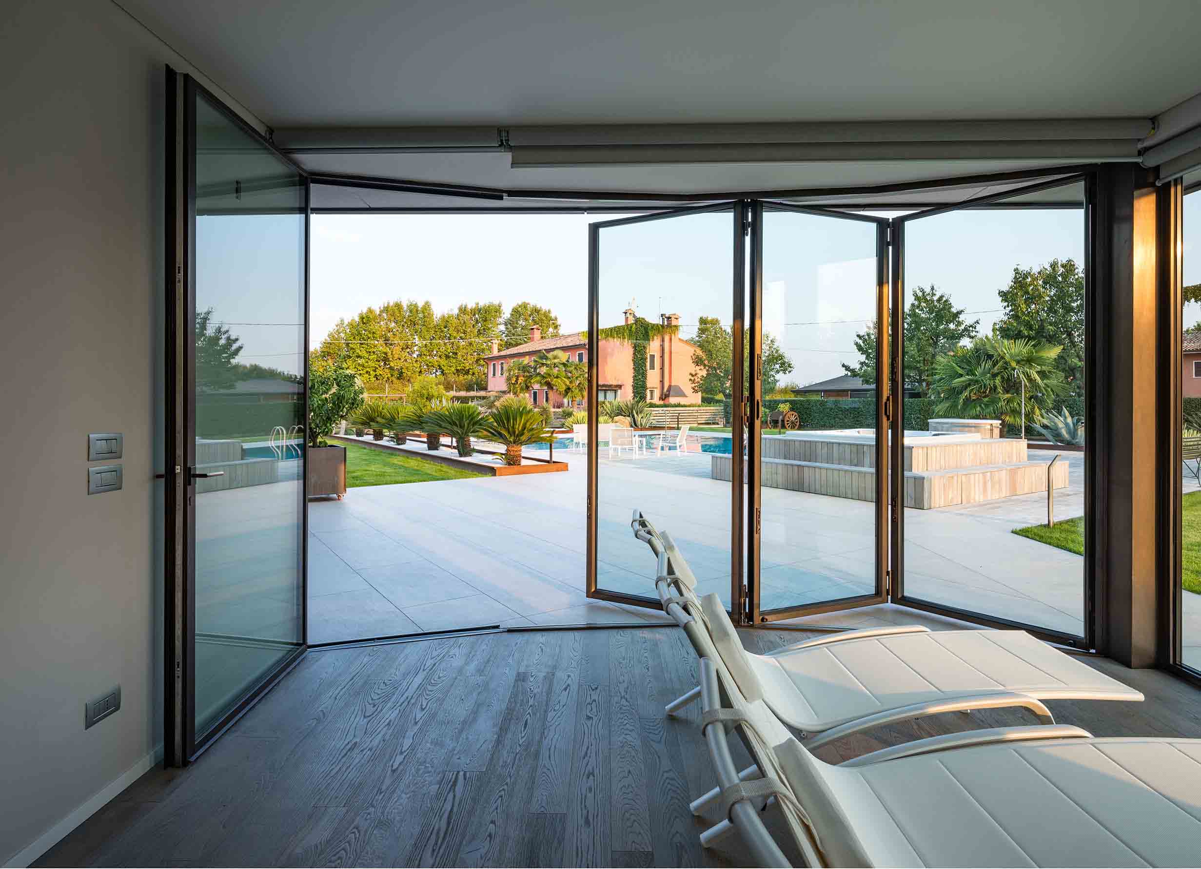 L’incredibile flessibilità delle porte pieghevoli permette la creazione di un numero di configurazioni praticamente infinito, di qualsiasi dimensione e stile, in grado di offrire panorami e vedute mozzafiato. Questo tipo di porte si dividono in due categorie: lineari e curve.