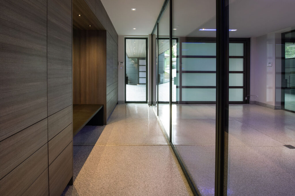 Un ingresso d’effetto trasmette fin dal primo impatto l’importanza e il valore della residenza che ci accingeremo a varcare: la porta d’accesso, un grande pivot pannellato, assume qui questo ruolo fondamentale. Fornita di serratura elettrica, questa prestigiosa porta d’ingresso accoglie con naturalezza nel pannello metallico, un inserto in legno studiato appositamente: porte, finestre sono così collegate con le presenza lignee della casa, per una perfetta armonia di colori e materiali.
