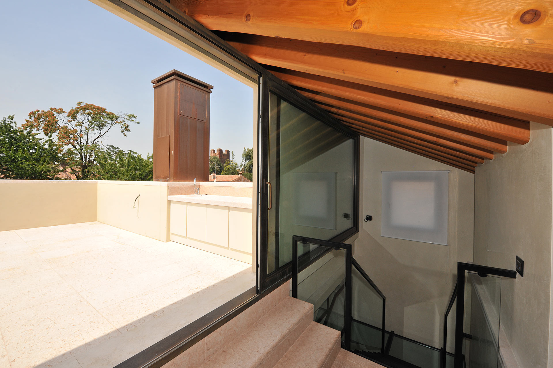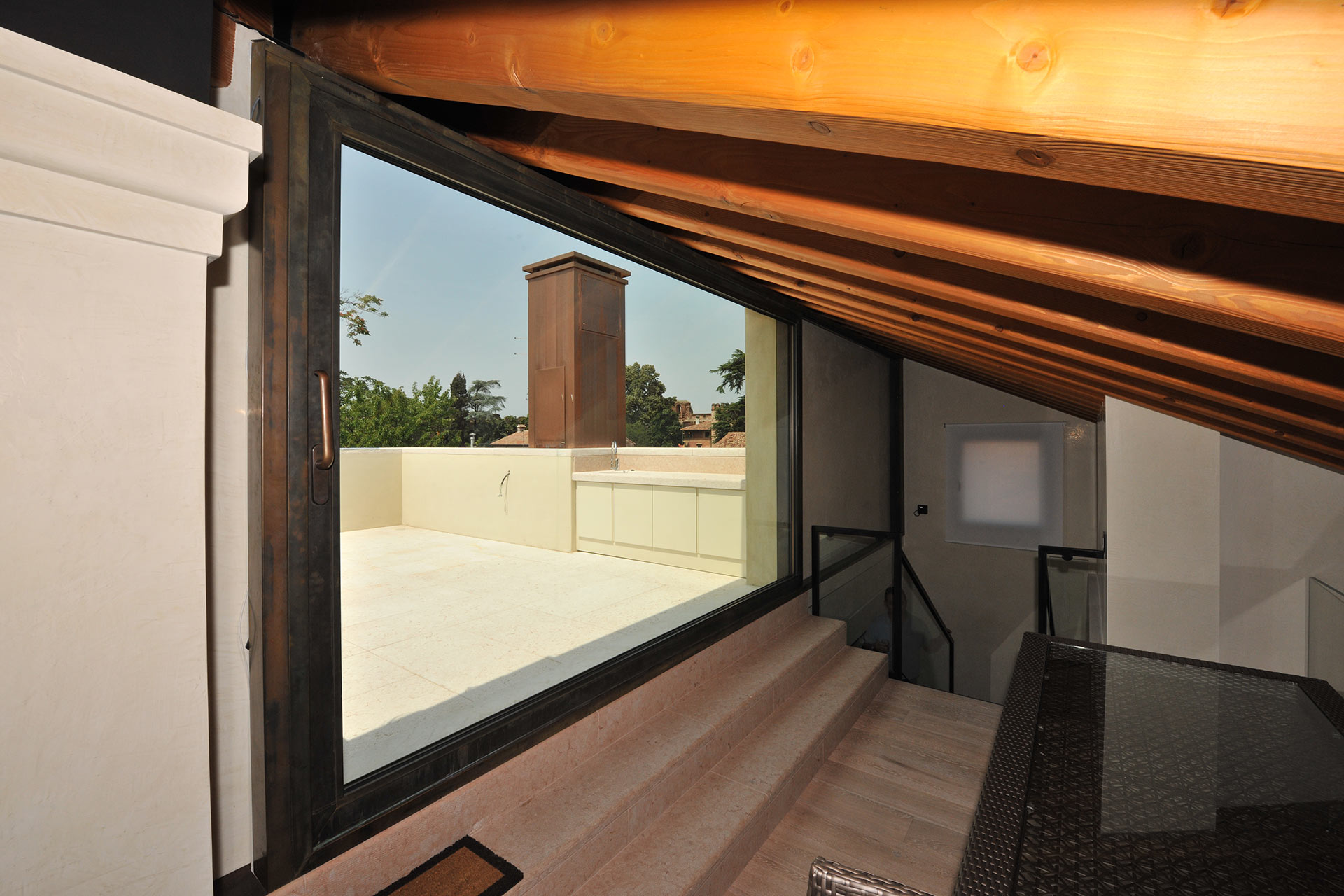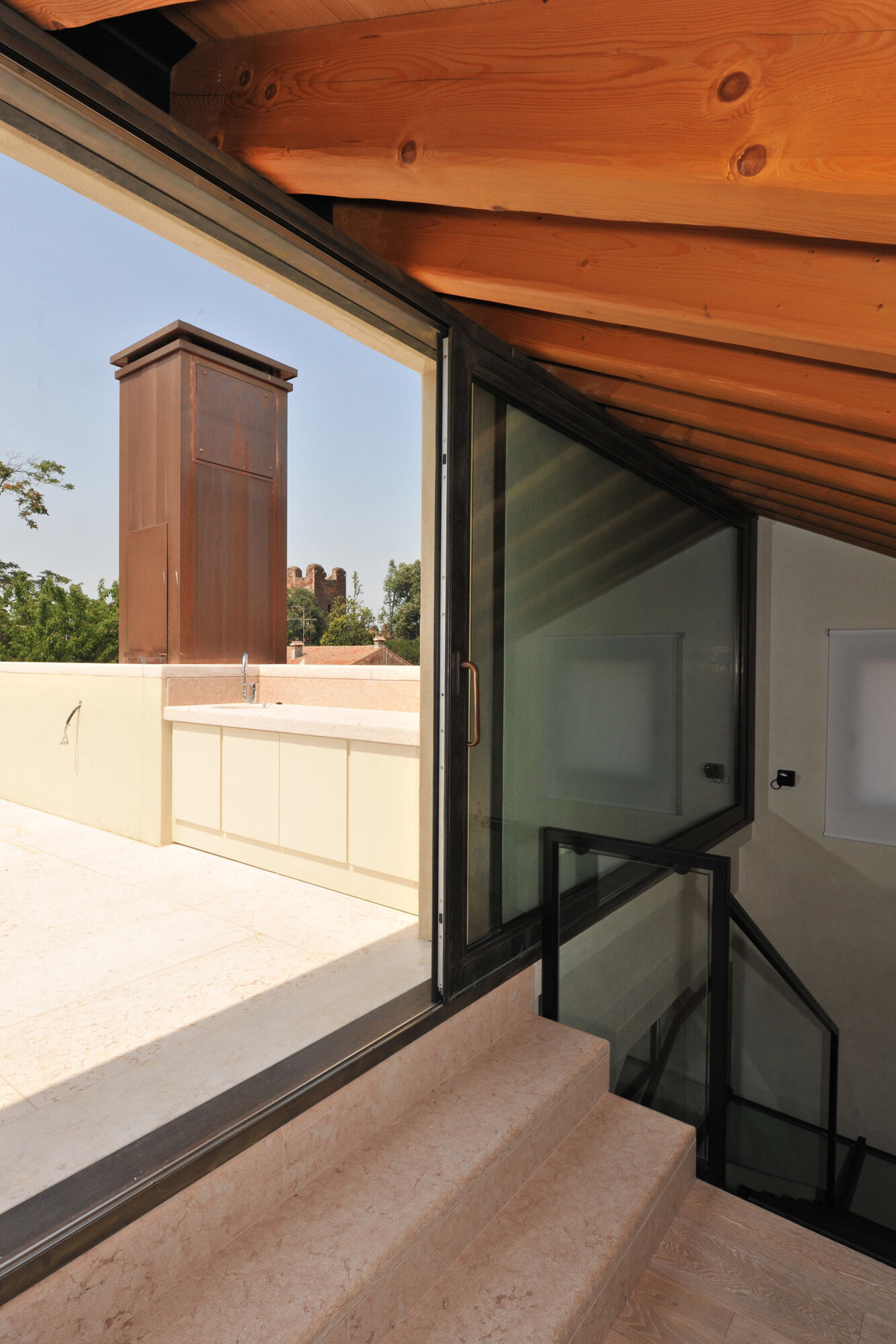 Un attico contemporaneo con infissi in ottone per uno stile di vita moderno. I proprietari di questo attico di notevoli dimensioni situato in centro della città diedero indicazioni molto precise sullo stile moderno che questo grande spazio avrebbe dovuto avere. La luce naturale avrebbe dovuto giocare il ruolo principale. La casa infatti è caratterizzata dalla presenza di numerose finestre che circondano tutta la struttura permettendo di sfruttare al massimo la luce diurna oltre a dare la possibilità di avere una vista a 360°. I serramenti in ottone brunito hanno dato un tocco di eleganza a questo spazio moderno. Al piano superiore è stata installata una porta scorrevole a taglio termico di grandi dimensioni che consente l’accesso alla terrazza fornendo una spettacolare vista sul castello medievale. Ottimo esempio di restauro architettonico grazie alla tecnologia impiegata per l’apertura di ampie vetrate Brombal su una splendida altana che rivalorizza dal punto di vista della vivibilità un edificio storico del centro di Castelfranco Veneto.