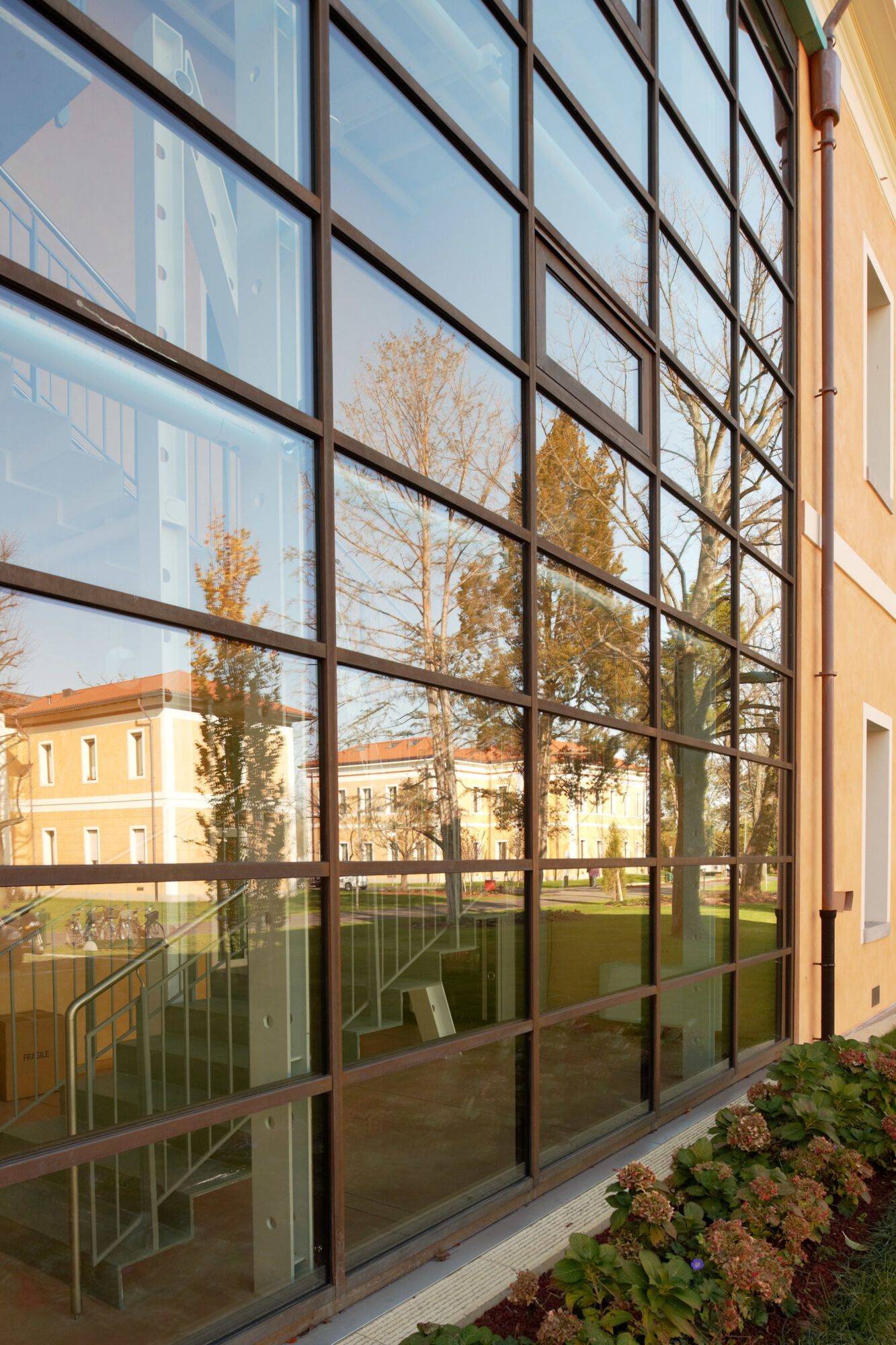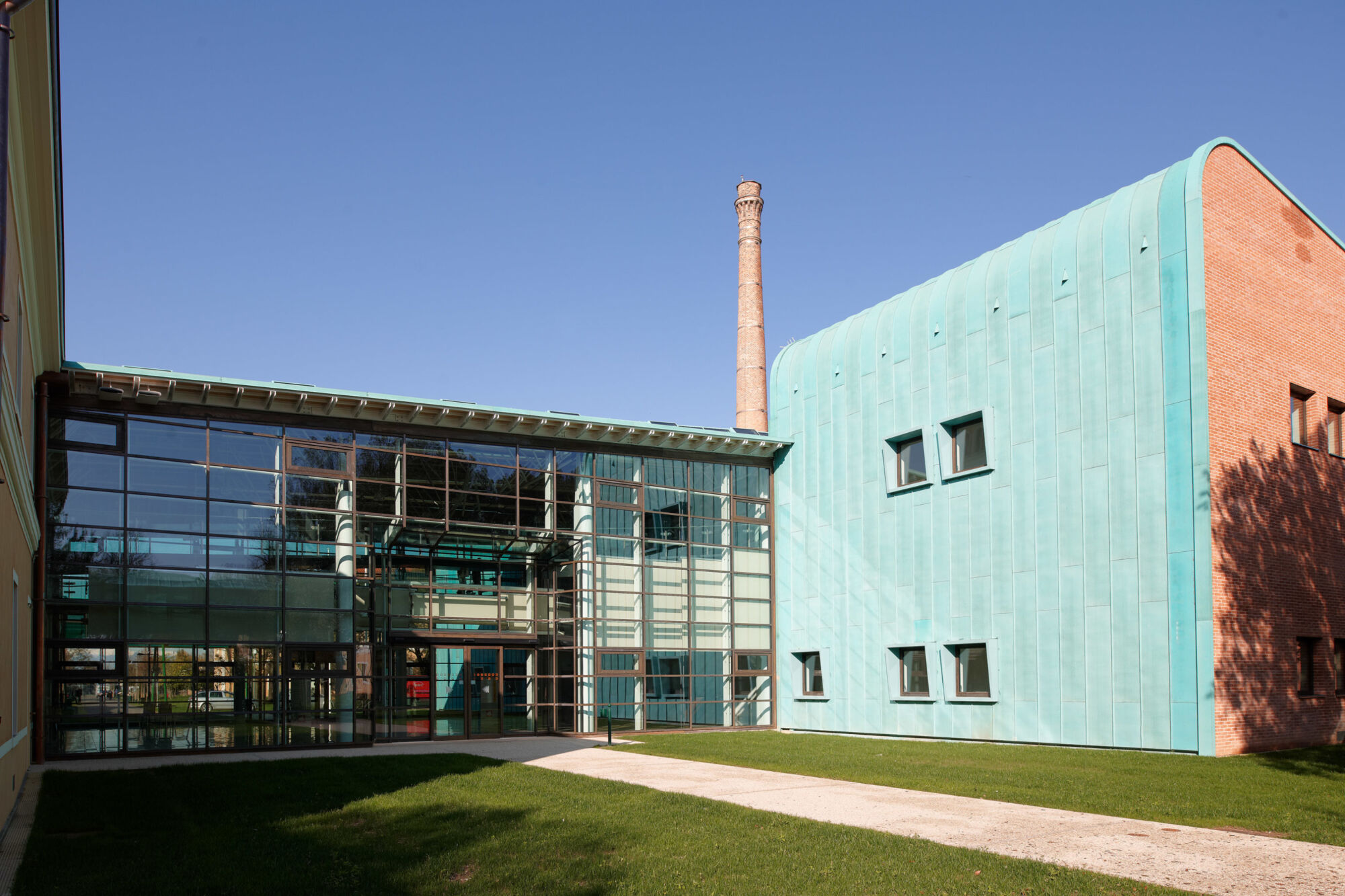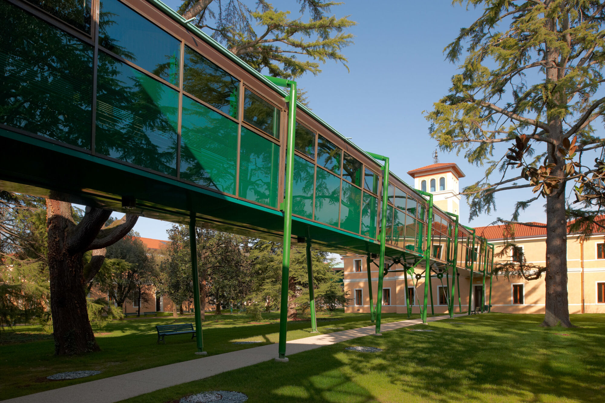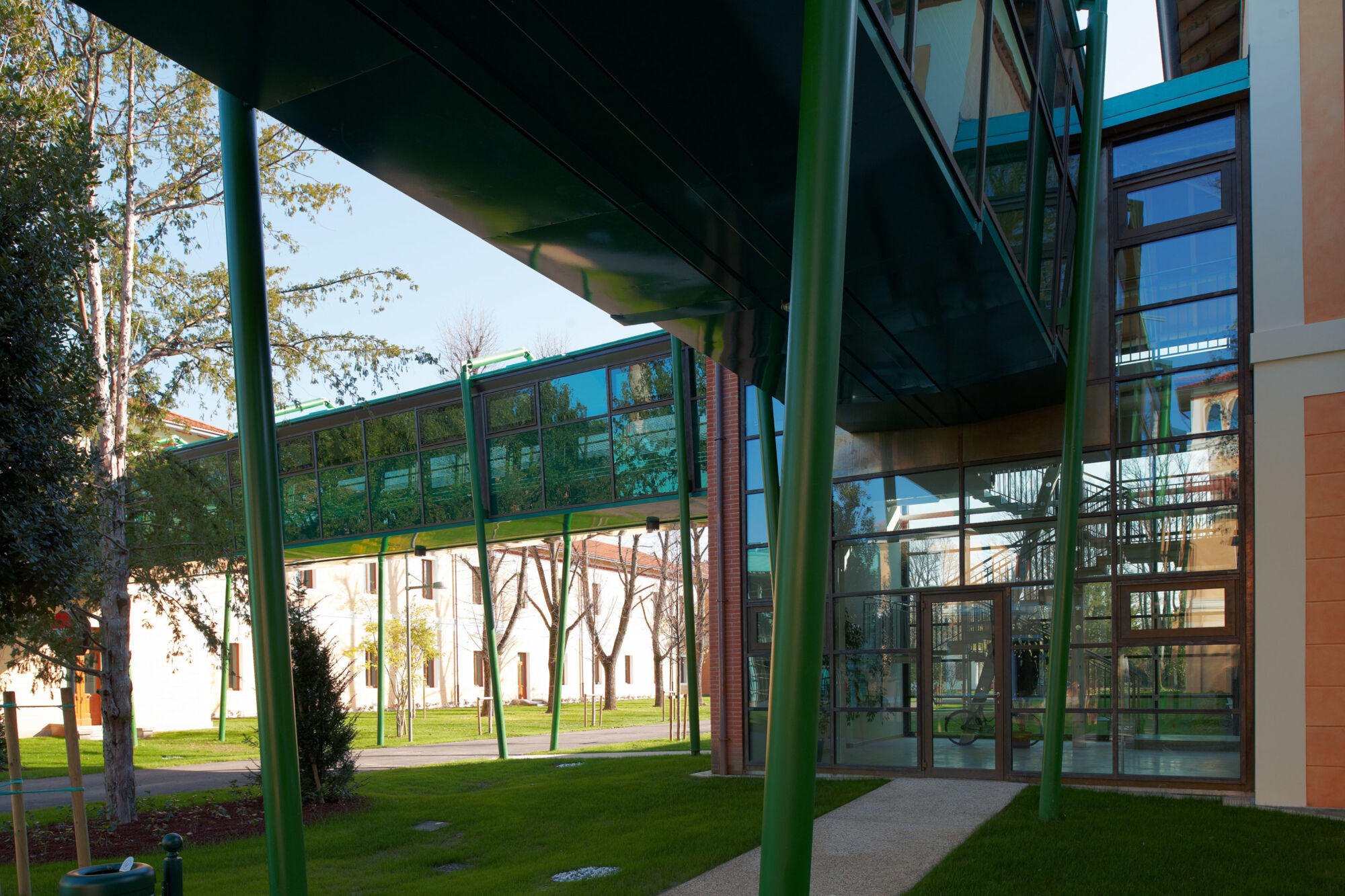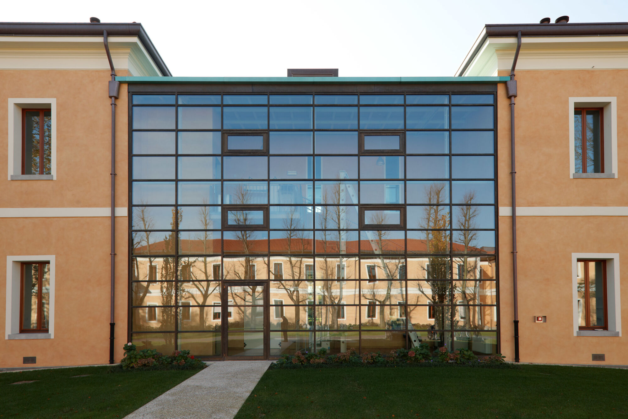 Un grande complesso pubblico con enormi facciate continue e struttura in bimetallo. Il progetto per questo grande complesso, sviluppato per la sede centrale della provincia di Treviso, ha implicato sia un rinnovamento di tipo funzionale della struttura preesistente sia la creazione di nuovi spazi. Brombal ha fornito l’intero sistema di vetrate, le cui parti principali sono essenzialmente due: la grande facciata continua all’ingresso e i tunnel fenestrati sopraelevati che fungono da collegamento tra i vari edifici che compongono la struttura. I serramenti e i sistemi a facciata continua sono stati realizzati in materiale bi-metal, acciaio zincato all’interno in 3 diversi colori, ed esternamente in ottone sfruttando la sua capacità di resistere agli agenti atmosferici. La Cittadella della Provincia di Treviso rappresenta un caso di architettura eclettica dove più elementi contemporanei formati da vetrate, coperture e gallerie realizzate con i serramenti Brombal si sono innestati nei volumi architettonici del vecchio complesso edilizio “Sant’Artemio”, dando nuova dinamicità al compendio novecentesco.