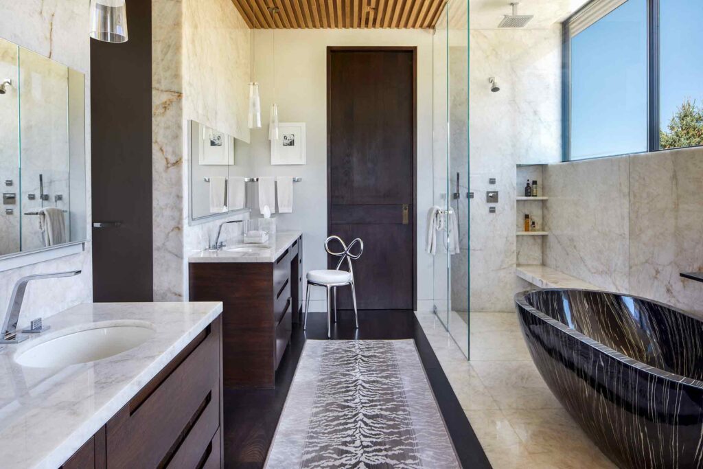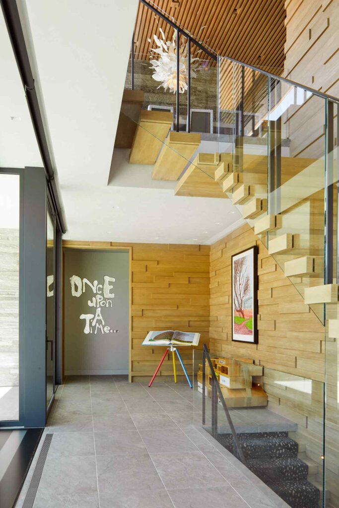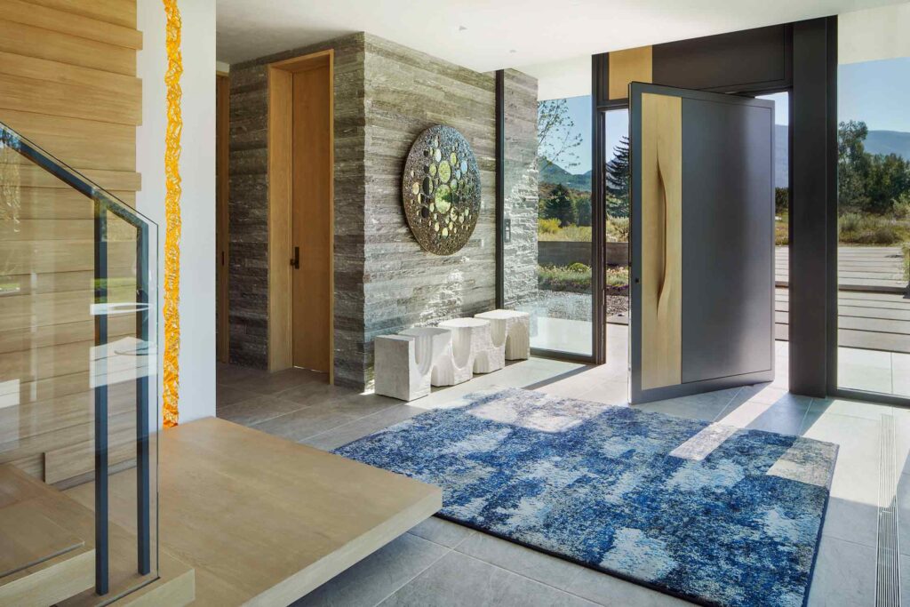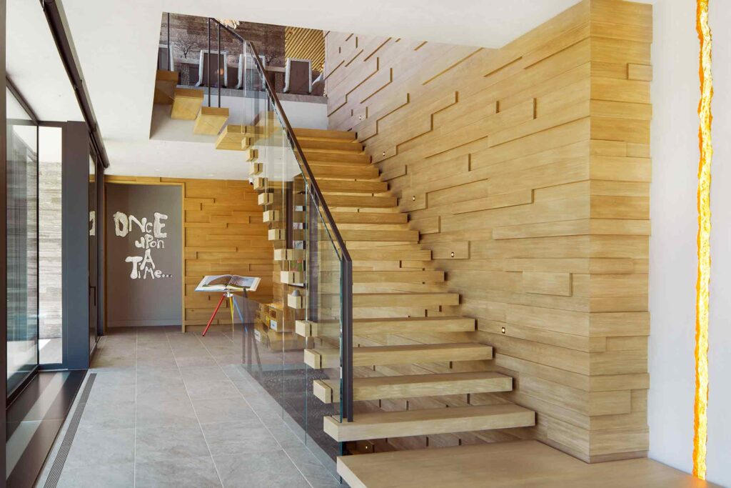 In this regard, the Butt-glazed fixed corners, almost totally glazed corners, lead to unlimited lightening and endless panoramic views. An impressive entrance conveys, since the first impact, the importance and value of the residence we are about to go through: the access door, a large panelled pivot, it’s instrumental here and take on a key role. Equipped with an electric lock, this prestigious entrance door naturally accommodates a specially designed wooden insert in the metal panel: doors and windows are thus connected with the rest of the house matching its wooden parts, for a perfect harmony of colours and materials.